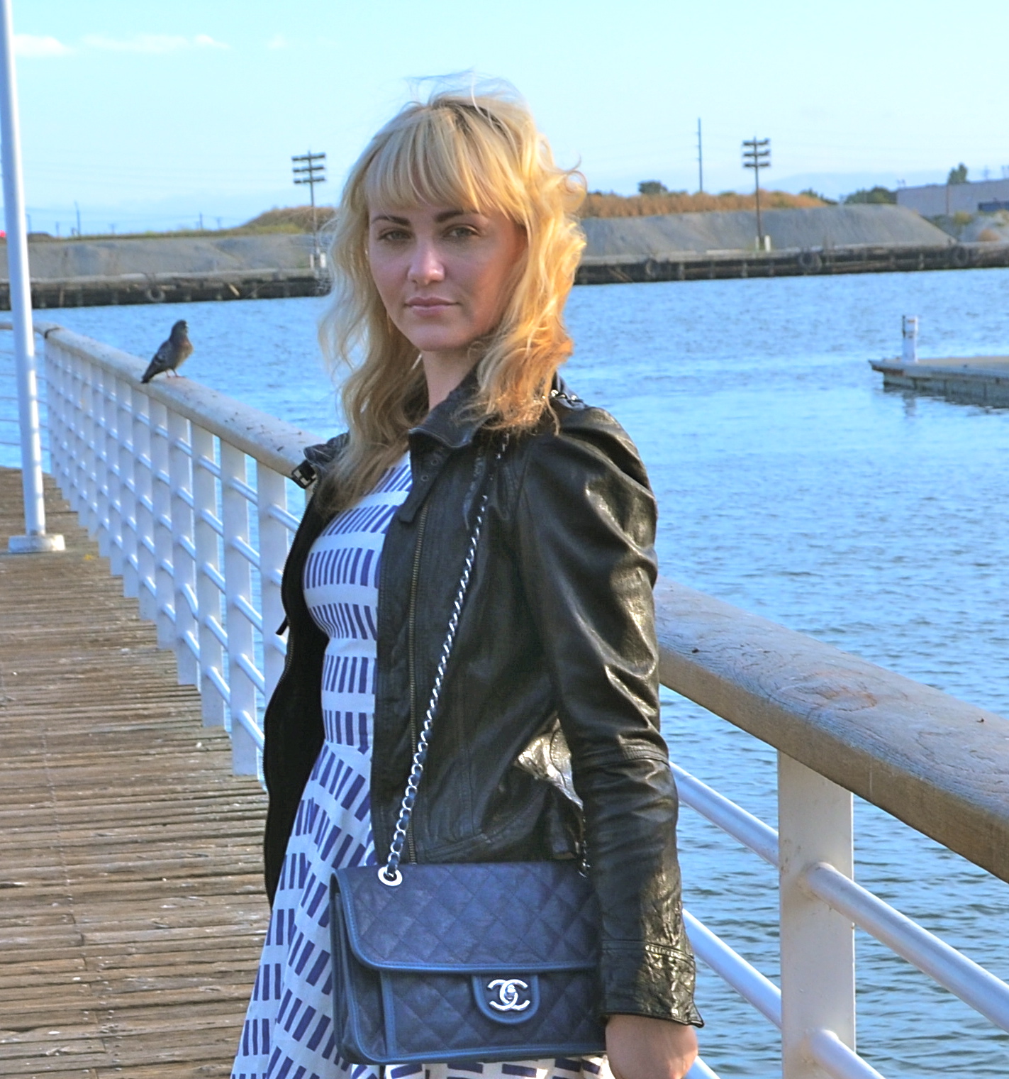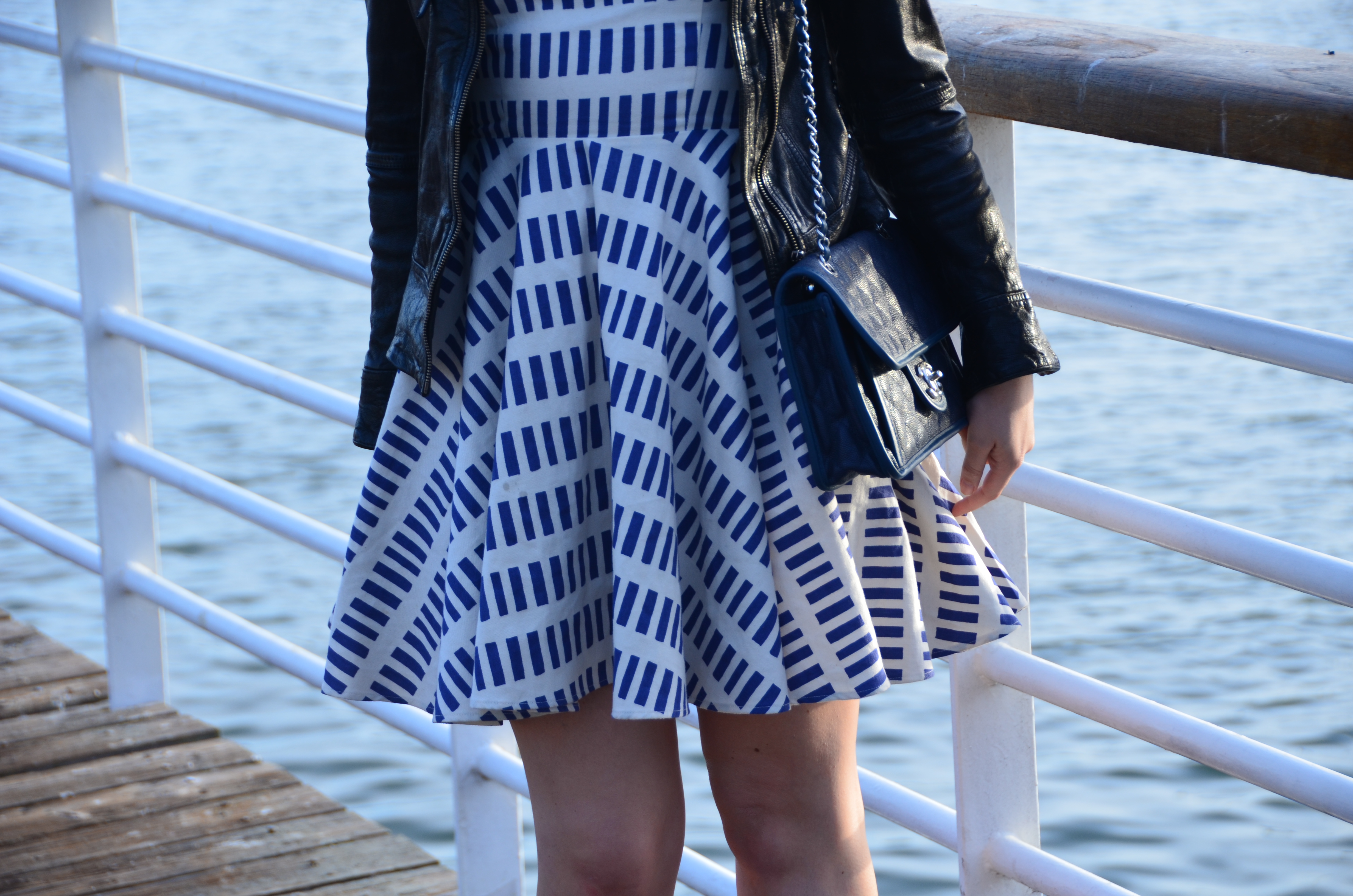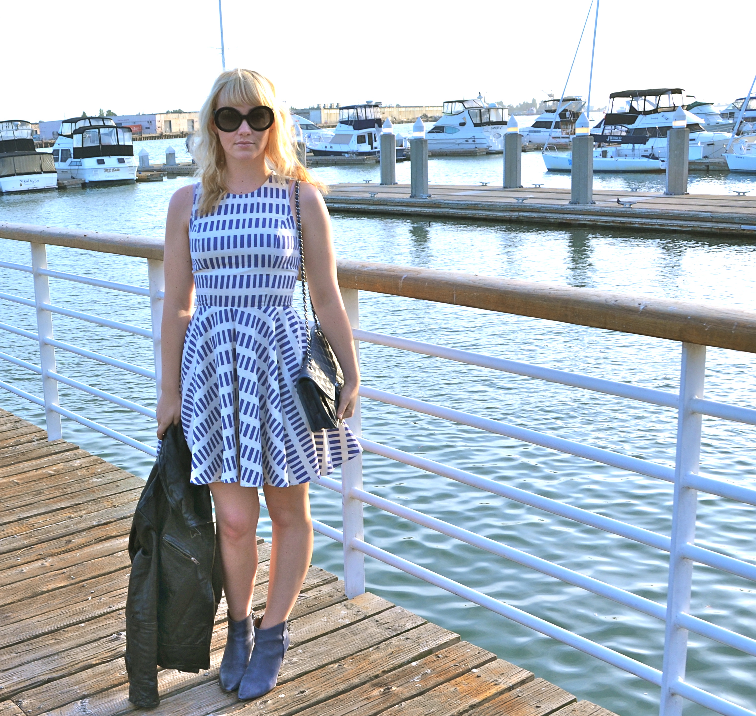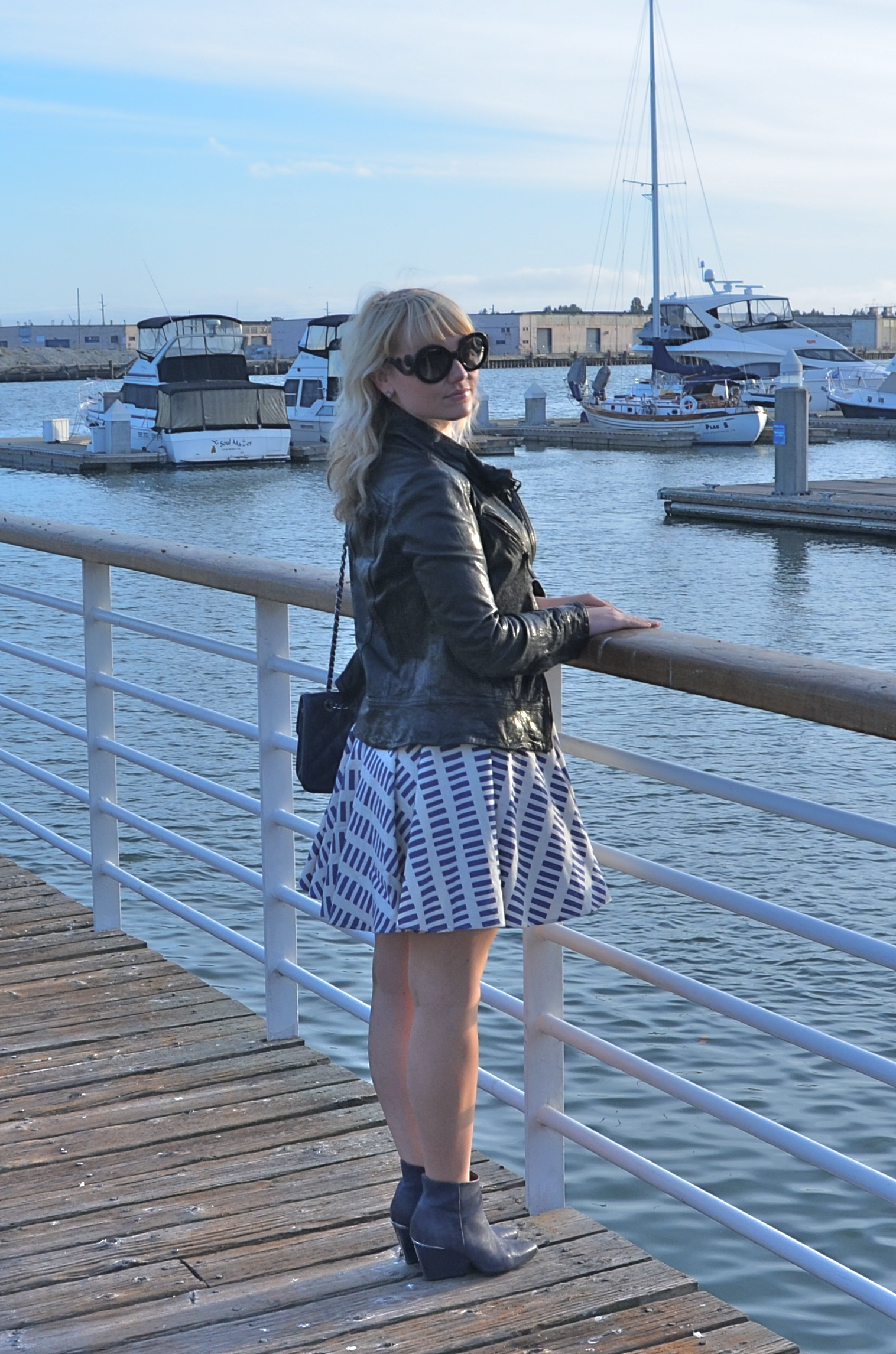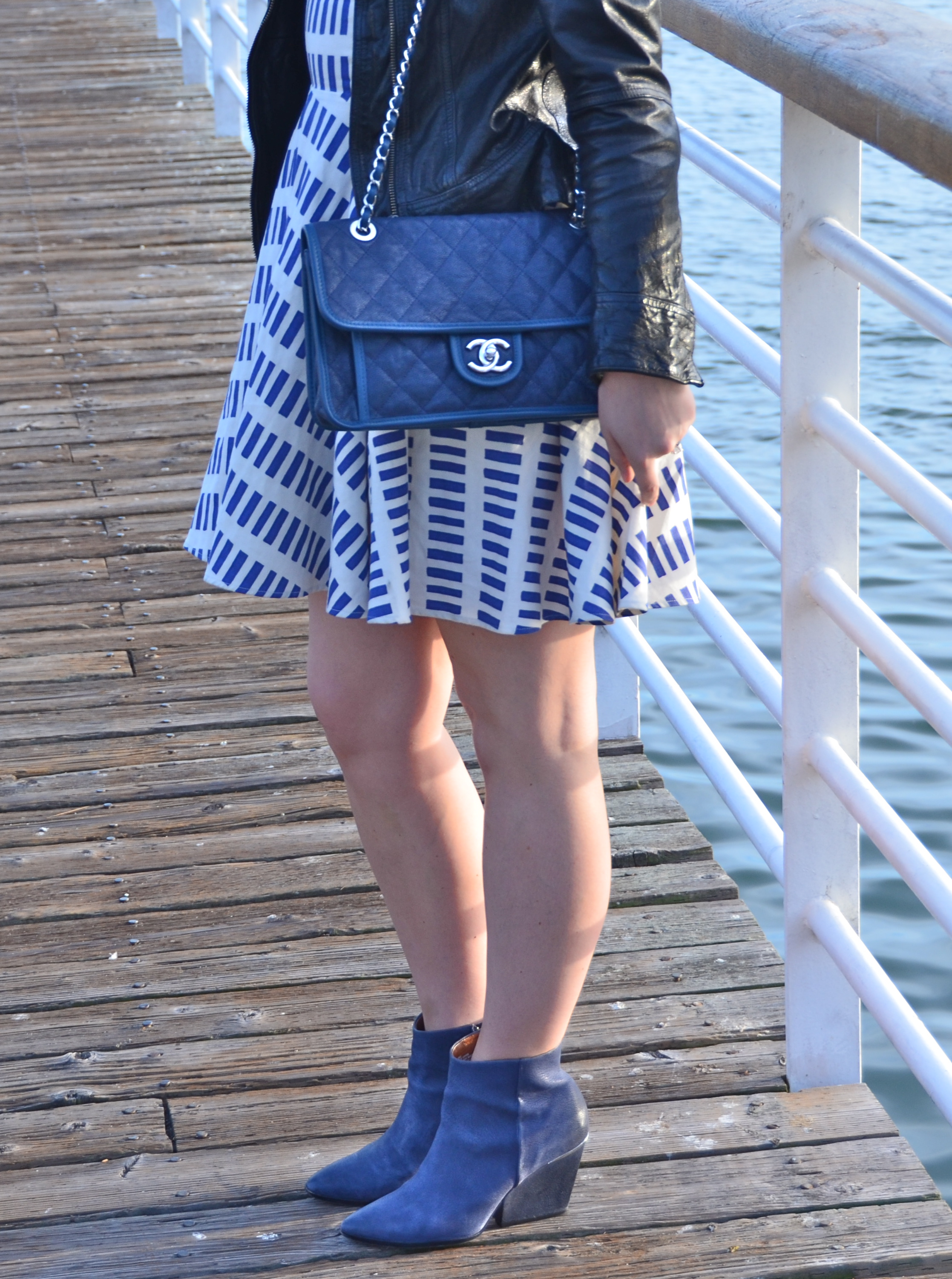 I usually ALWAYS go for black, but a new fresh addition of navy accessories to my wardrobe is changing my mind.  My navy Chanel flap bag and Boutique 9 booties are my go to shoe and bag of the moment.  They mesh with almost every color and will translate through each season seamlessly.  Today I am wearing my favorite Dusen Dusen circle skirt dress and an Allsaints leather jacket that has been a staple in my closet for 3 years with the beautiful backdrop of Oakland’s Jack London Square.