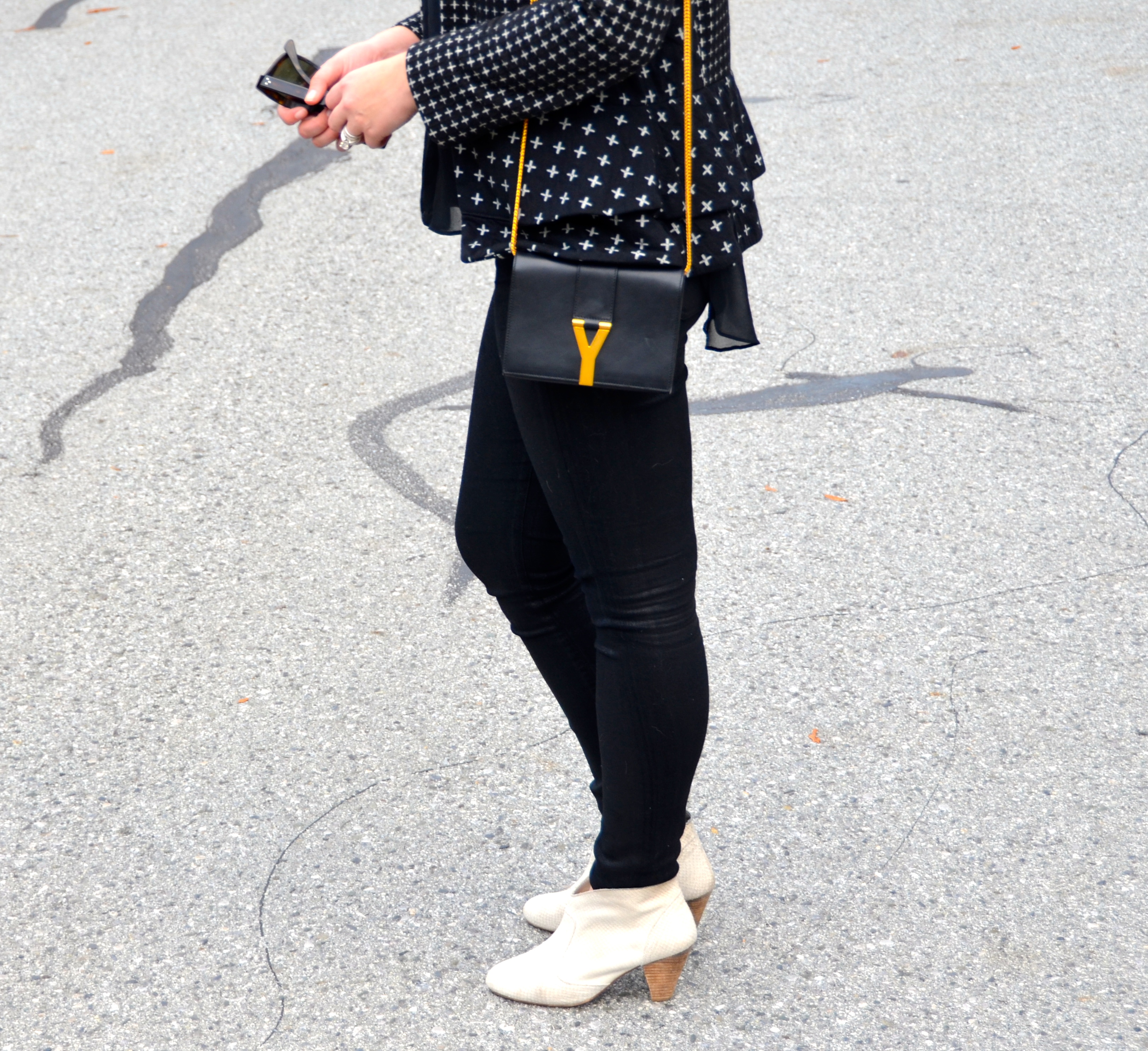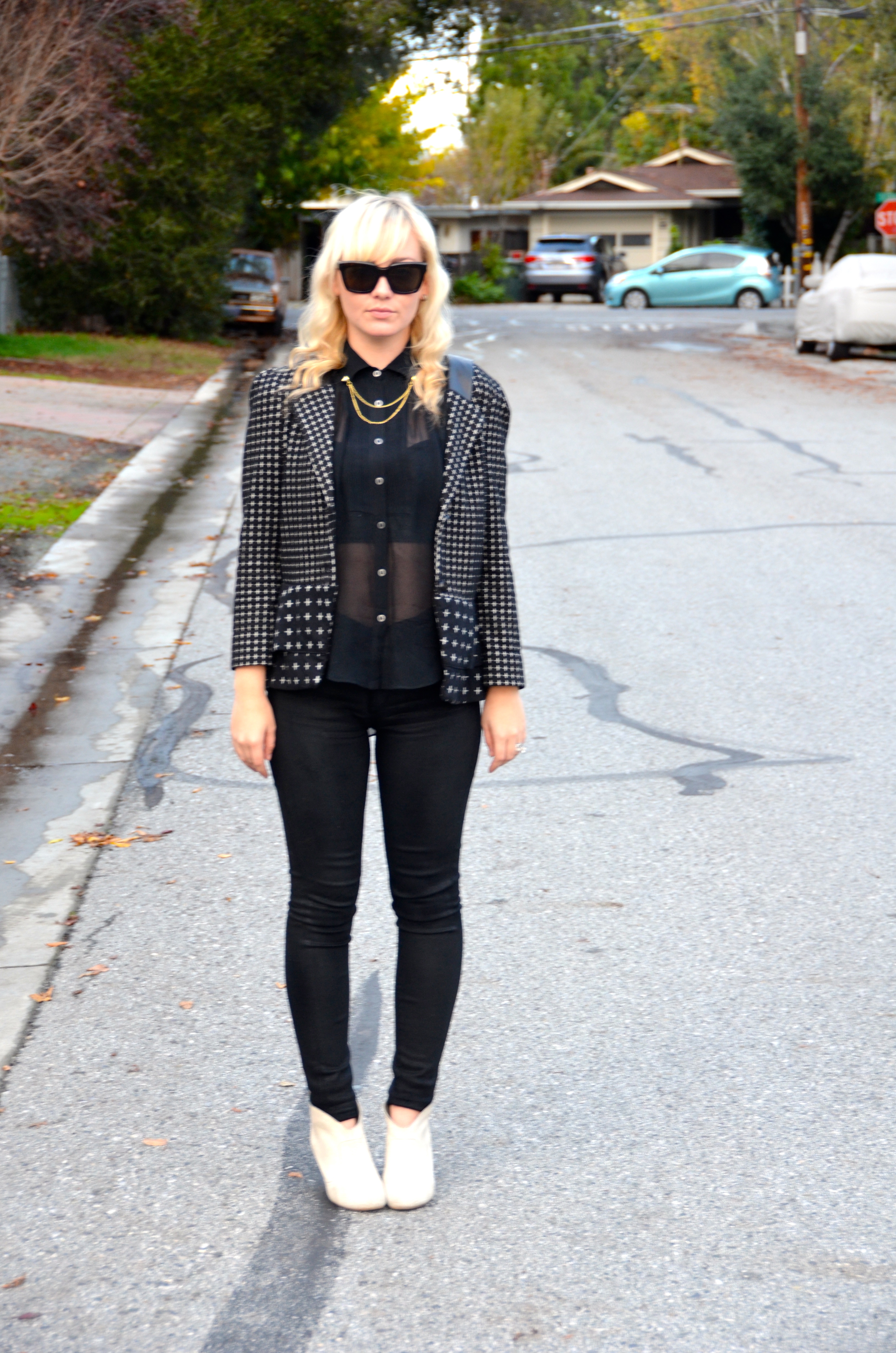 I officially have 2 more weeks of school until I earn my graduate degree from FIDM!!! I am so busy but I still try and stay stylish even when I do not have time. I am also starting to think about what I am going to wear when I present my final portfolio to the heads of the Product Development program. I love this black and white blazer from Anthropologie (similar). It is polished and edgy at the same time. I paired it with a silk Allsaints (similar) button down ( I would wear a cami underneath for my presentation), coated high waisted Citizens of Humanity jeans, my white Sixty Seven booties (similar) and my new favorite accessory, these collar tips from Honeydrip. Collar tips are an easy way to replace the statement necklace and spruce up any button down! Wish me luck in my last few weeks of school and happy almost holidays!!