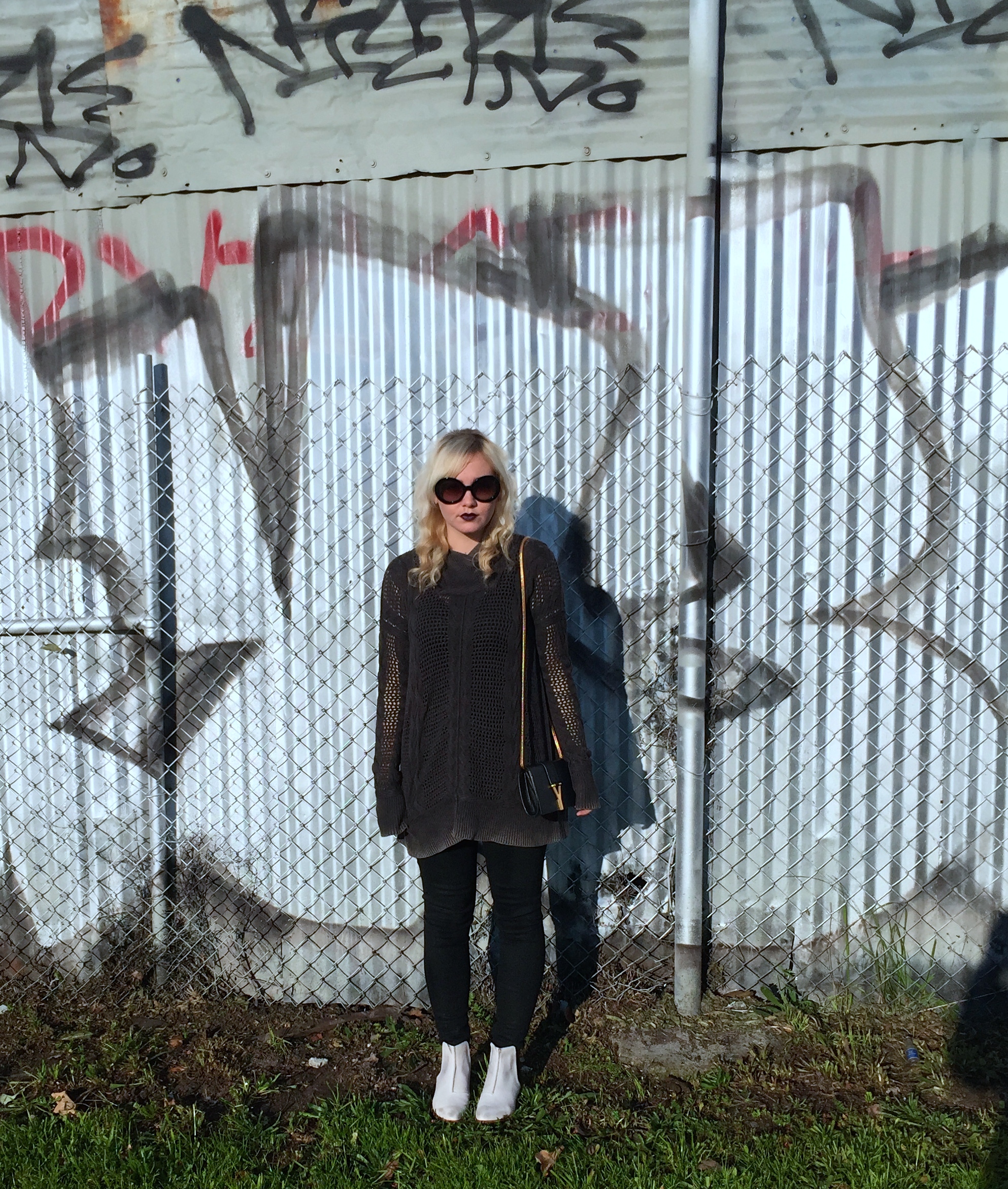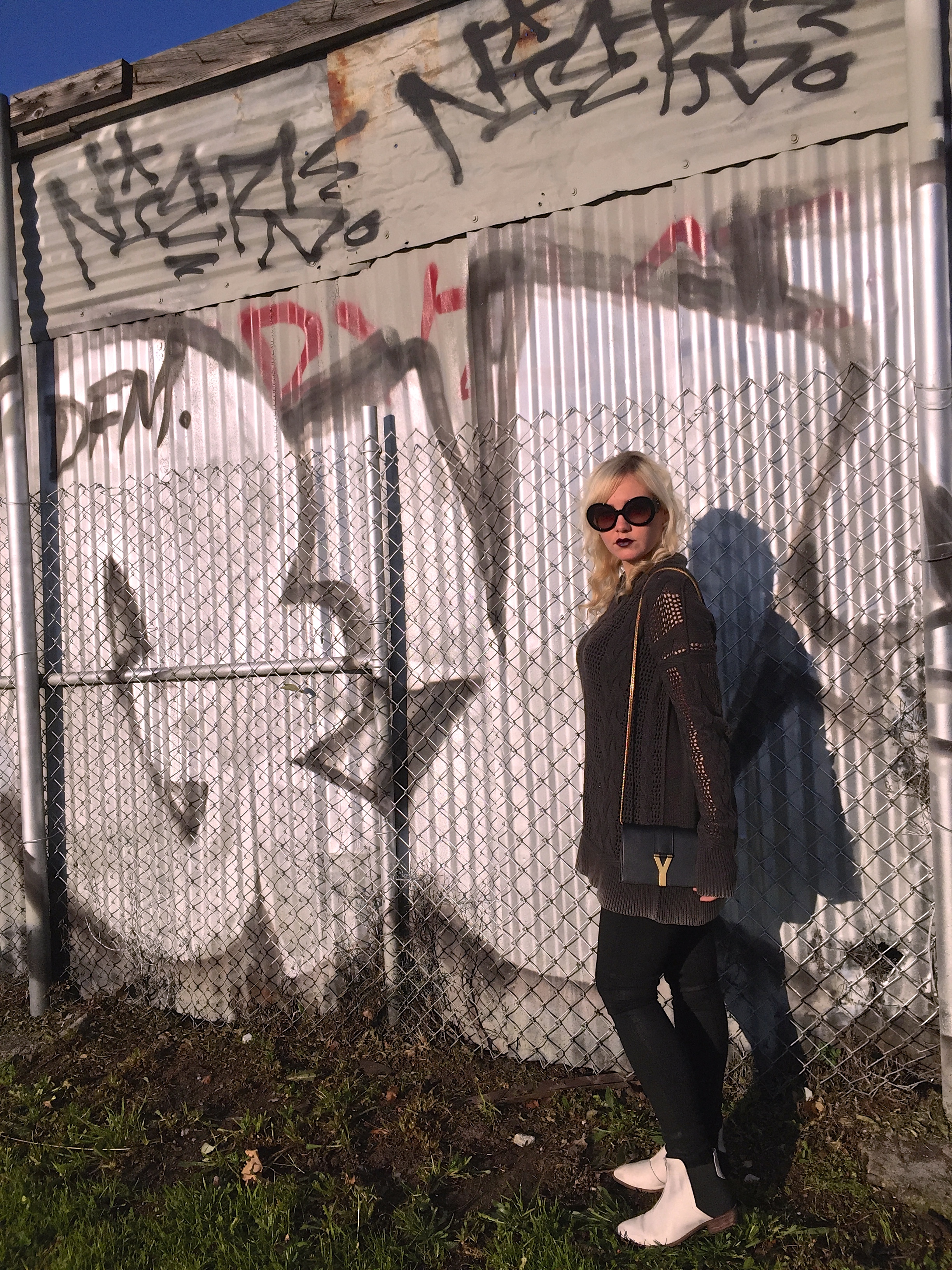 After brunch, we did a little style shoot on the side of the road. It is still pretty cold so I went with an Allsaints sweater (similar), resin coated Citizens of humanity jeans, Free People booties and my fave dark purple Cyber lipstick by MAC.