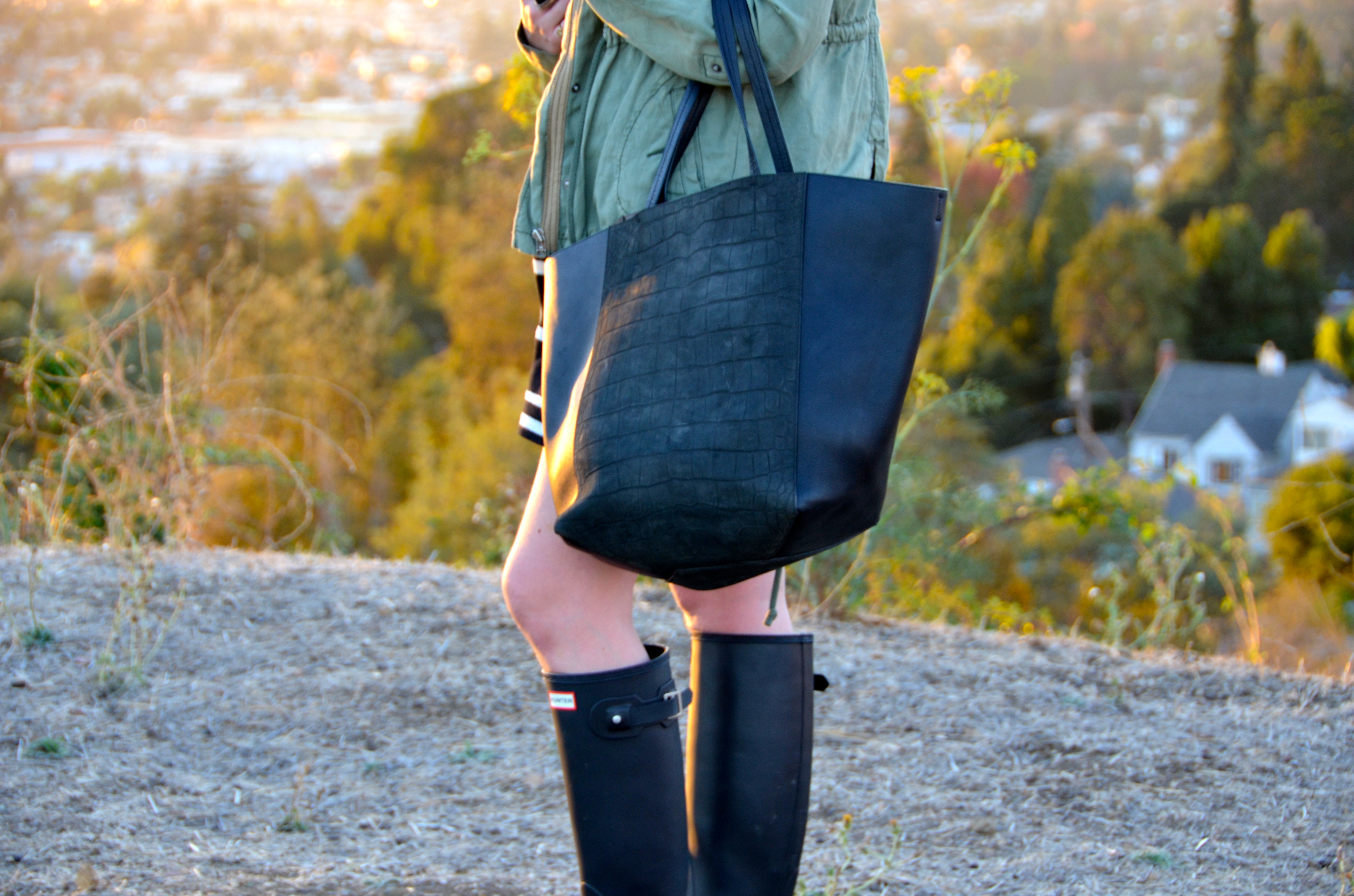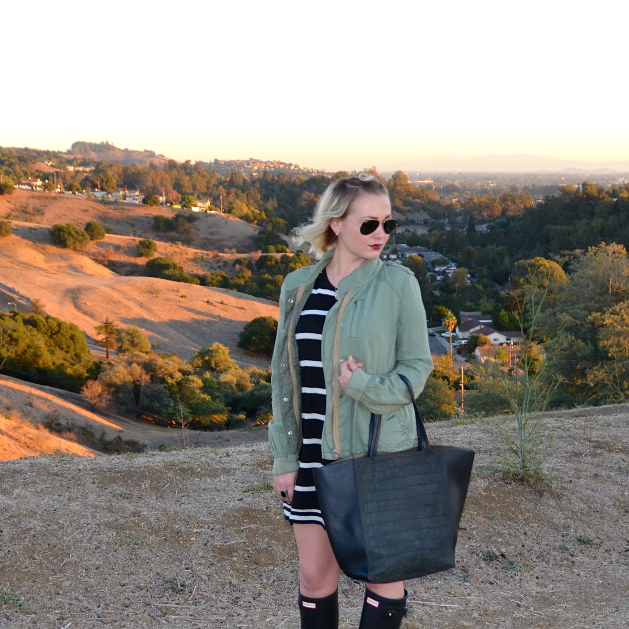 Now that it has FINALLY cooled down in California, I can bring out my fall layers. One of my staples for this season is this military jacket (similar) that I paired with my summer striped t-shirt dress (similar). I love being able to transition my summer favorites into fall with just a second layer. My other go-to is my Hunter Boots, rain or shine they are a classic that I love with dresses or skinny jeans. I hope you guys are having a great week, thanks for stopping by!